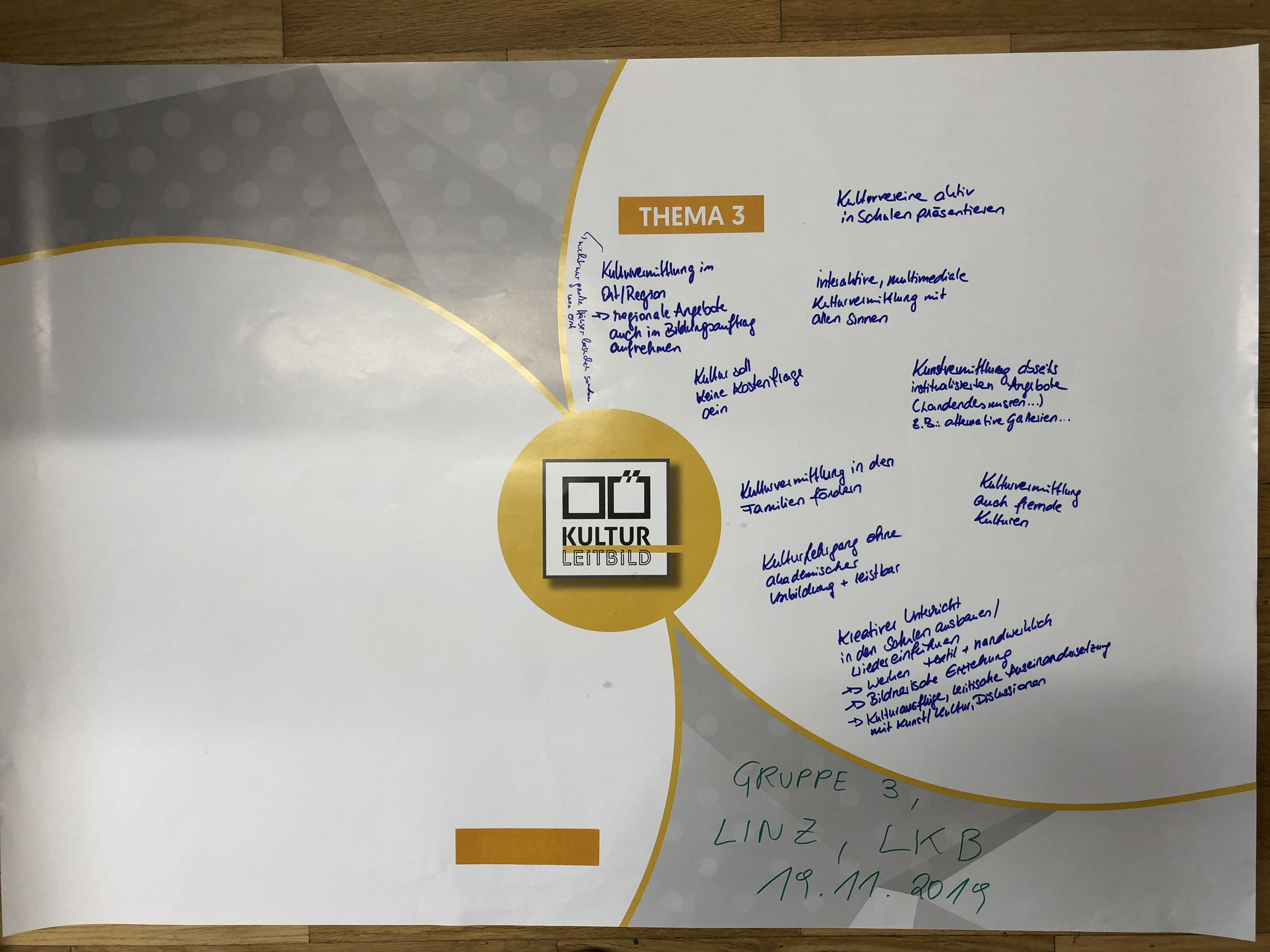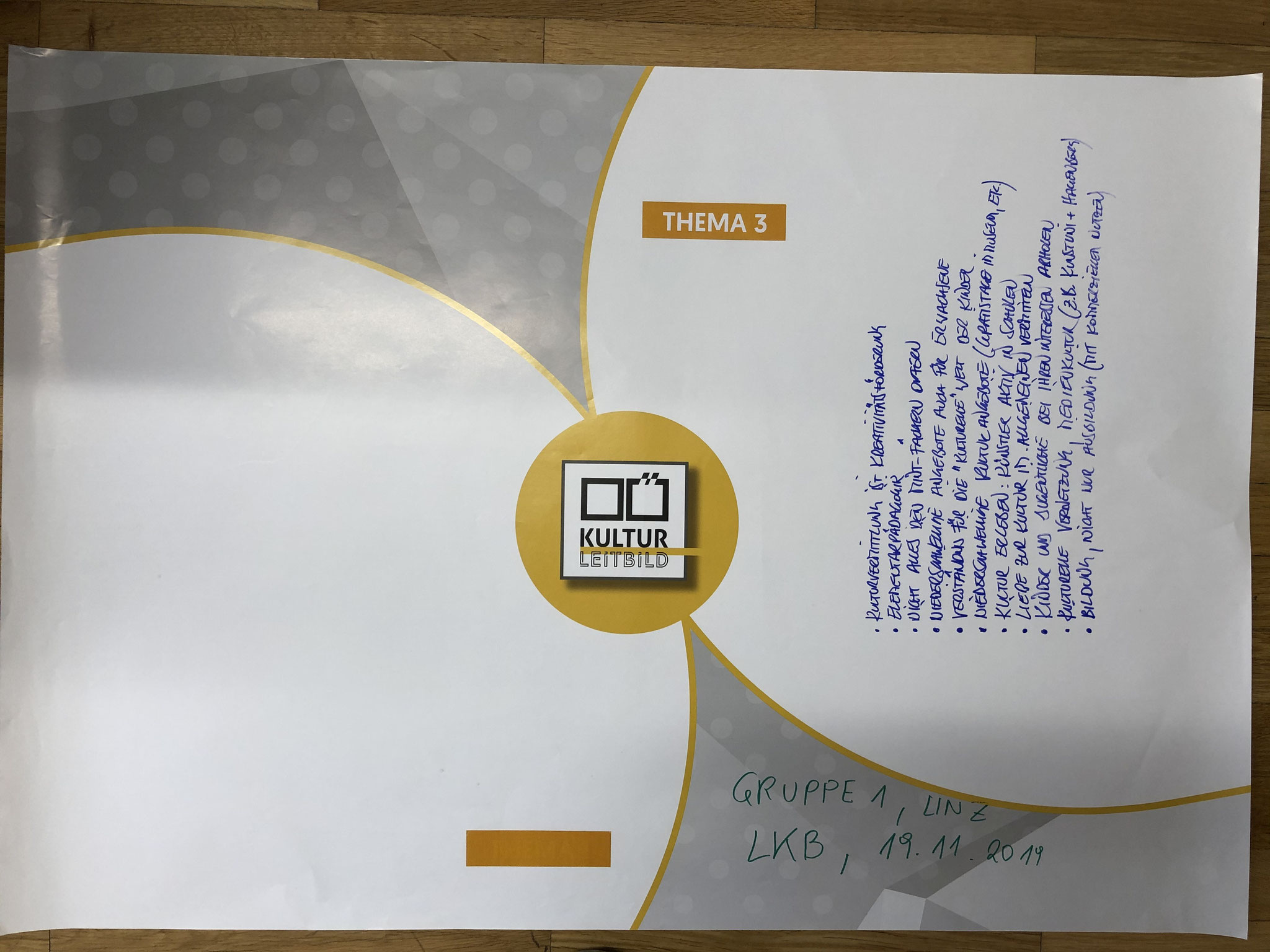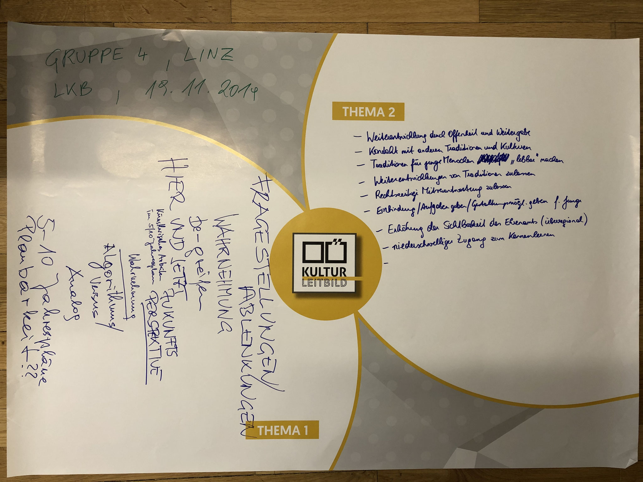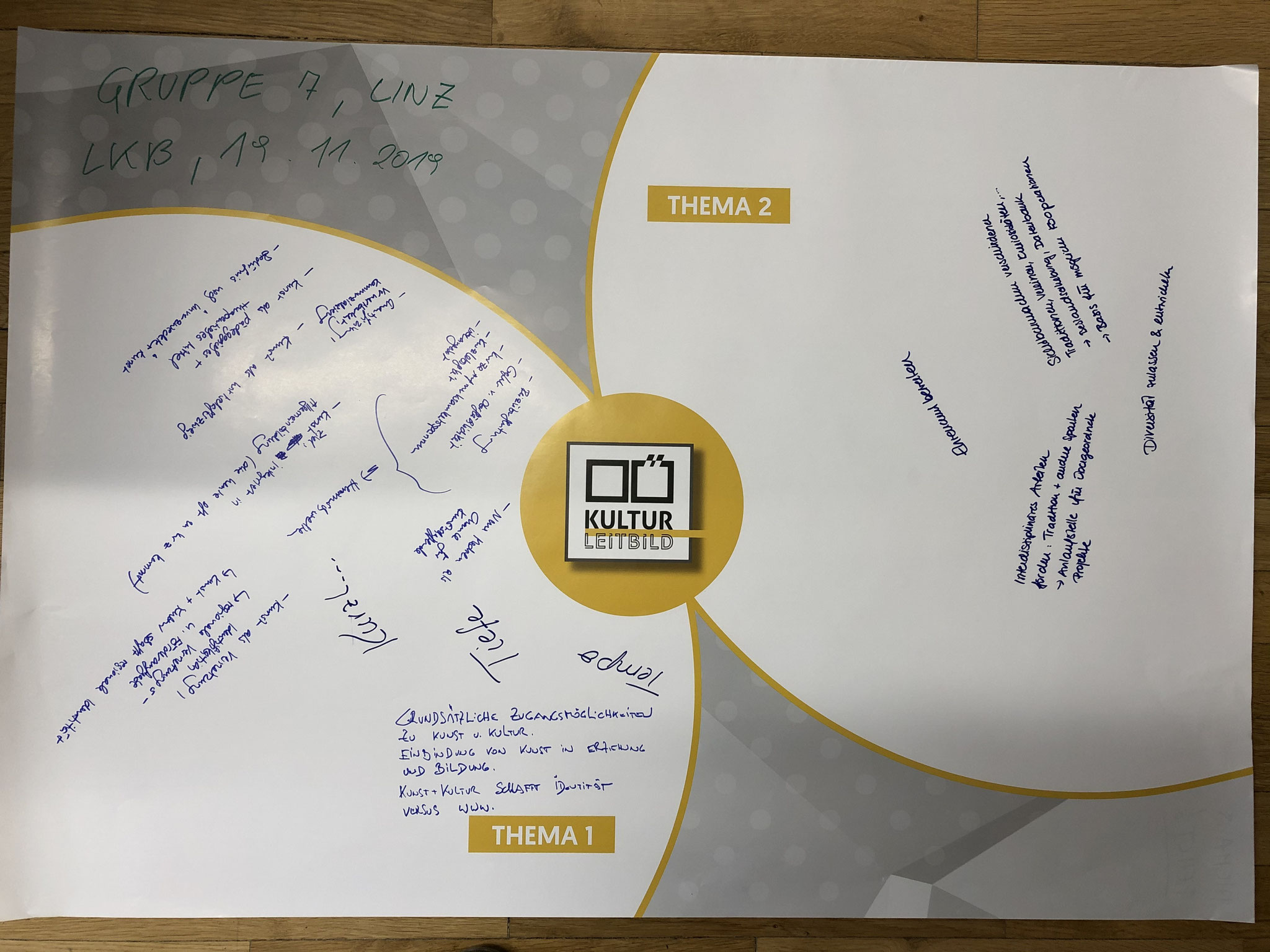 Die Mitglieder und Ersatzmitglieder des Landeskulturbeirats wurden vom Vorsitzenden Dr. Josef Stockinger am 19. November 2019 zu einer Diskussion zum neuen Kulturleitbild in die Redoutensäle eingeladen. Was den Ablauf dieser Diskussion betrifft, wurde das Format der regionalen Diskussionen grundsätzlich beibehalten, nur inhaltlich gab es eine Adaption, die den Kreis zur Auftaktveranstaltung in der OÖ. Landesbibliothek geschlossen hat.