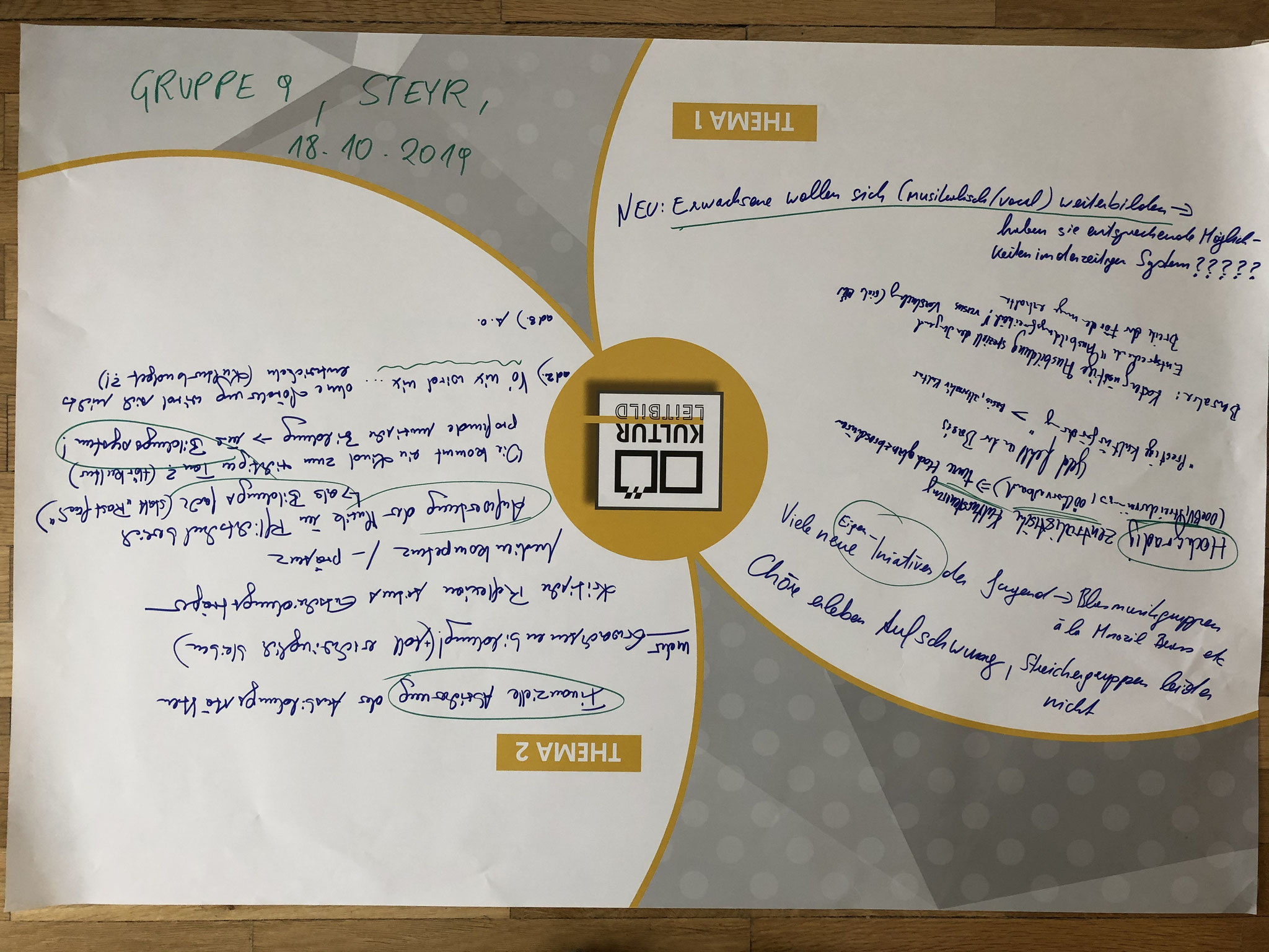 Im Rahmen der regionalen Diskussionen sind die Teilnehmerinnen und Teilnehmer eingeladen worden, in einem "World Cafe" (mehr zu diesem Format finden Sie im Blog) ihre Thesen zu zwei Fragenstellungen zu formulieren und auf einem Plakat niederzuschreiben: