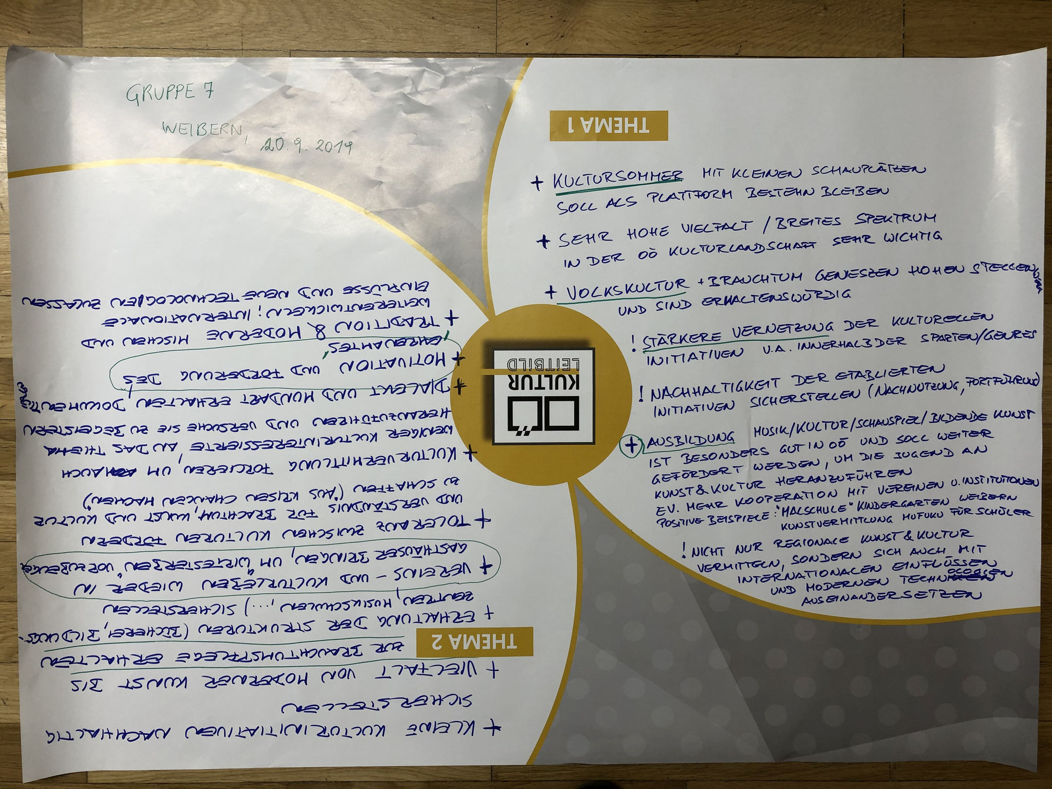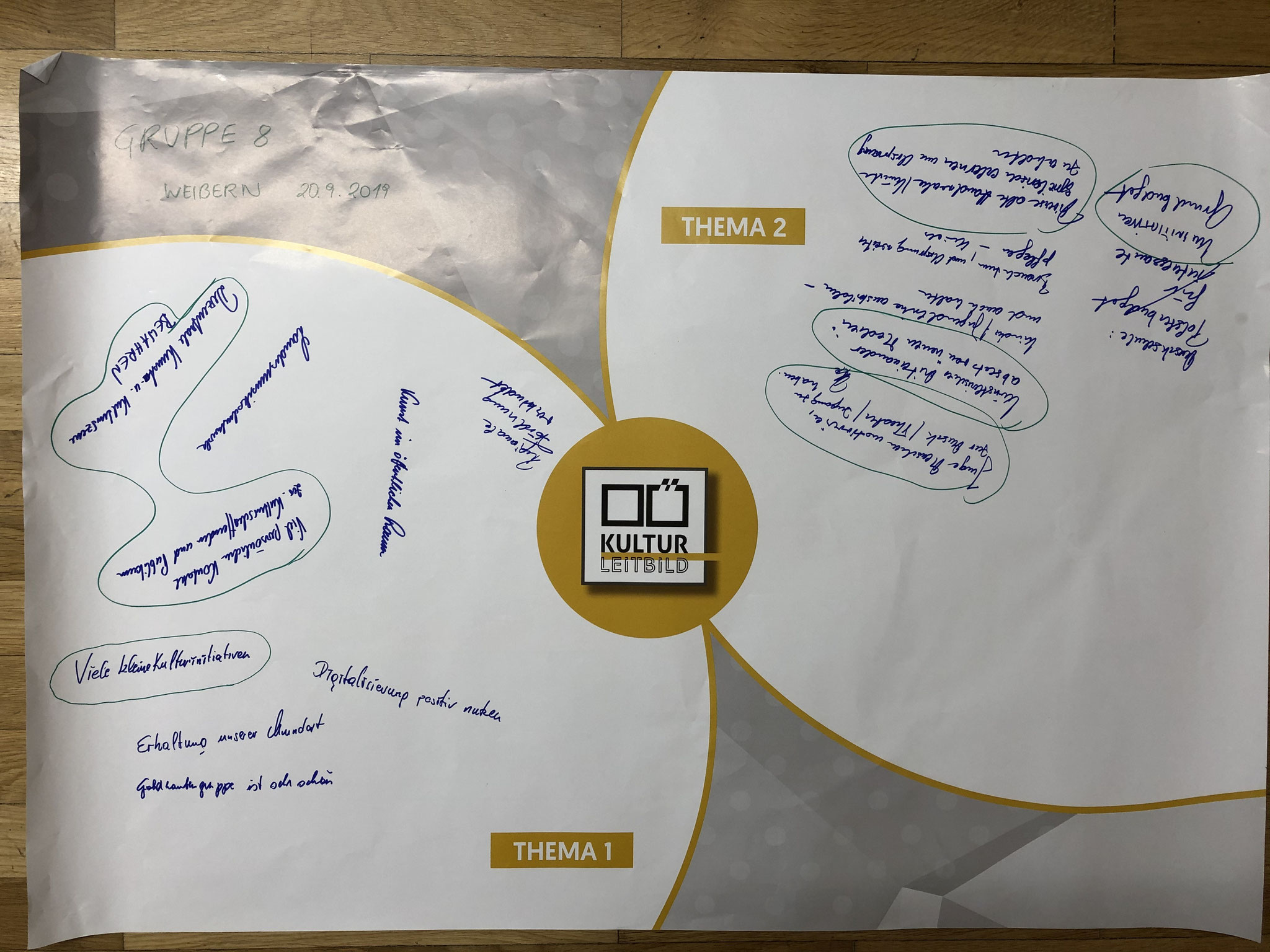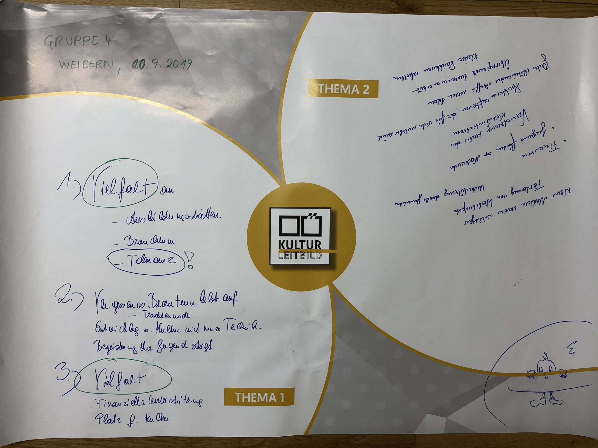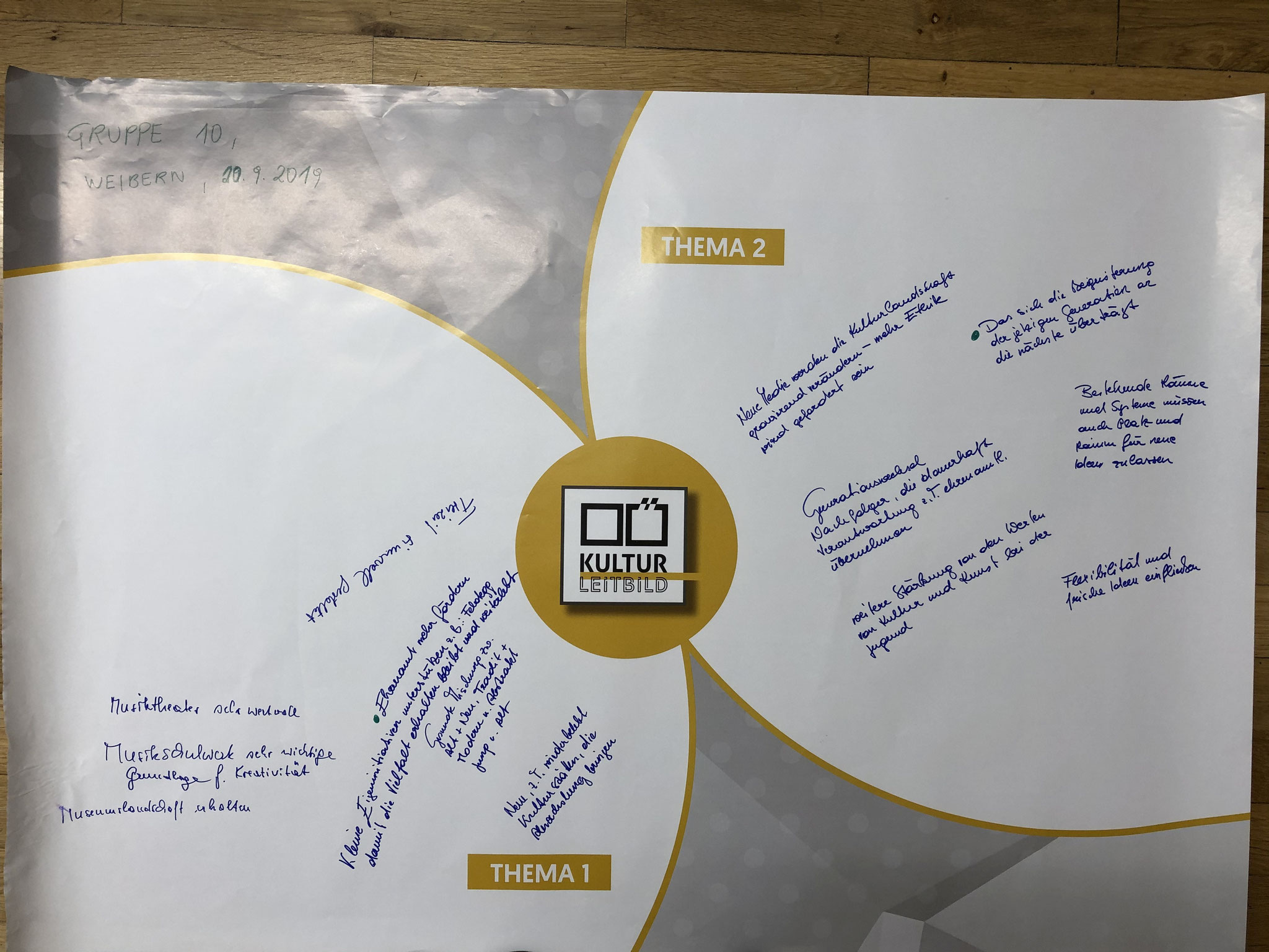 Im Rahmen der regionalen Diskussionen sind die Teilnehmerinnen und Teilnehmer eingeladen worden, in einem "World Cafe" (mehr zu diesem Format finden Sie im Blog) ihre Thesen zu zwei Fragenstellungen zu formulieren und auf einem Plakat niederzuschreiben: