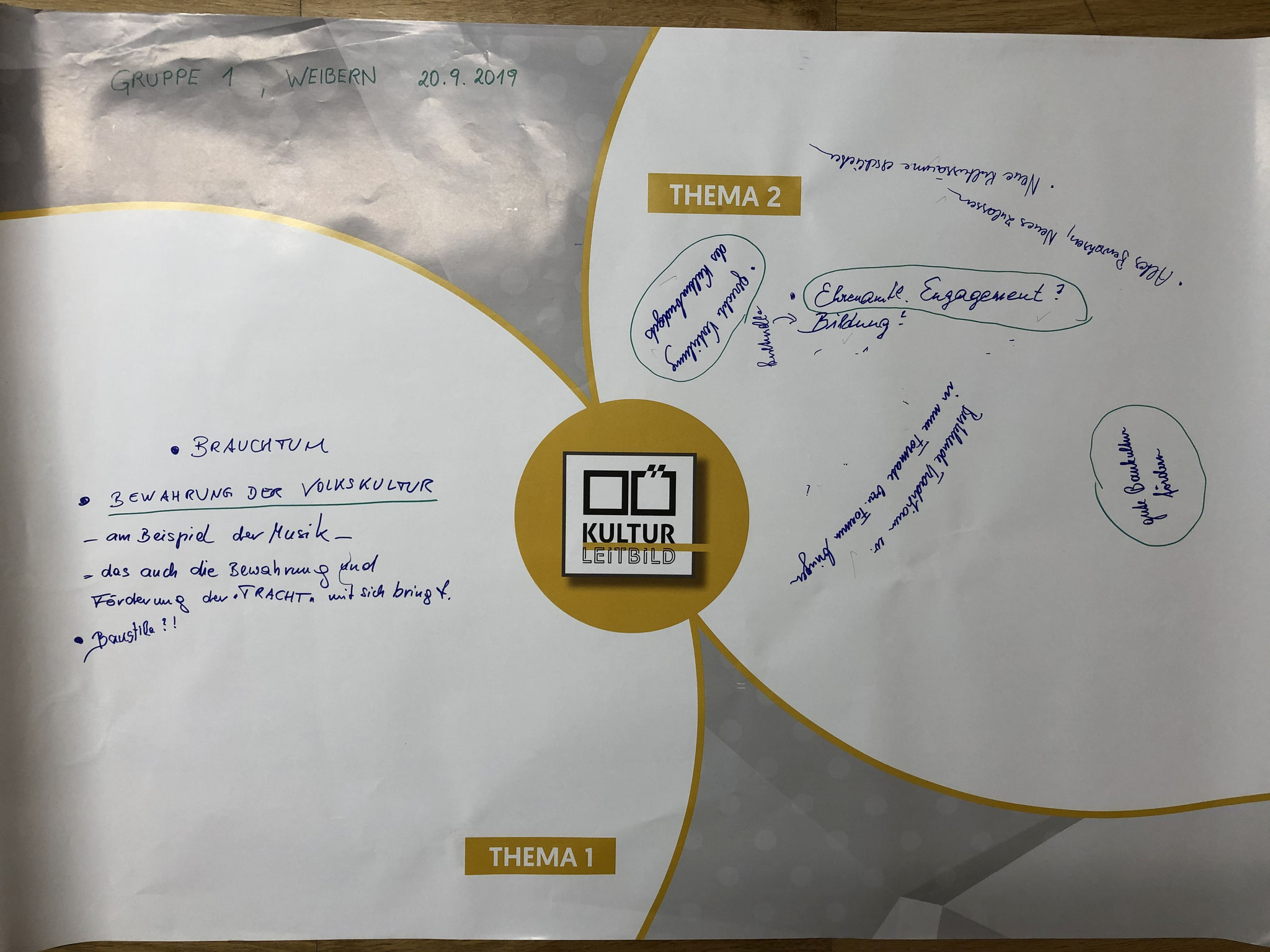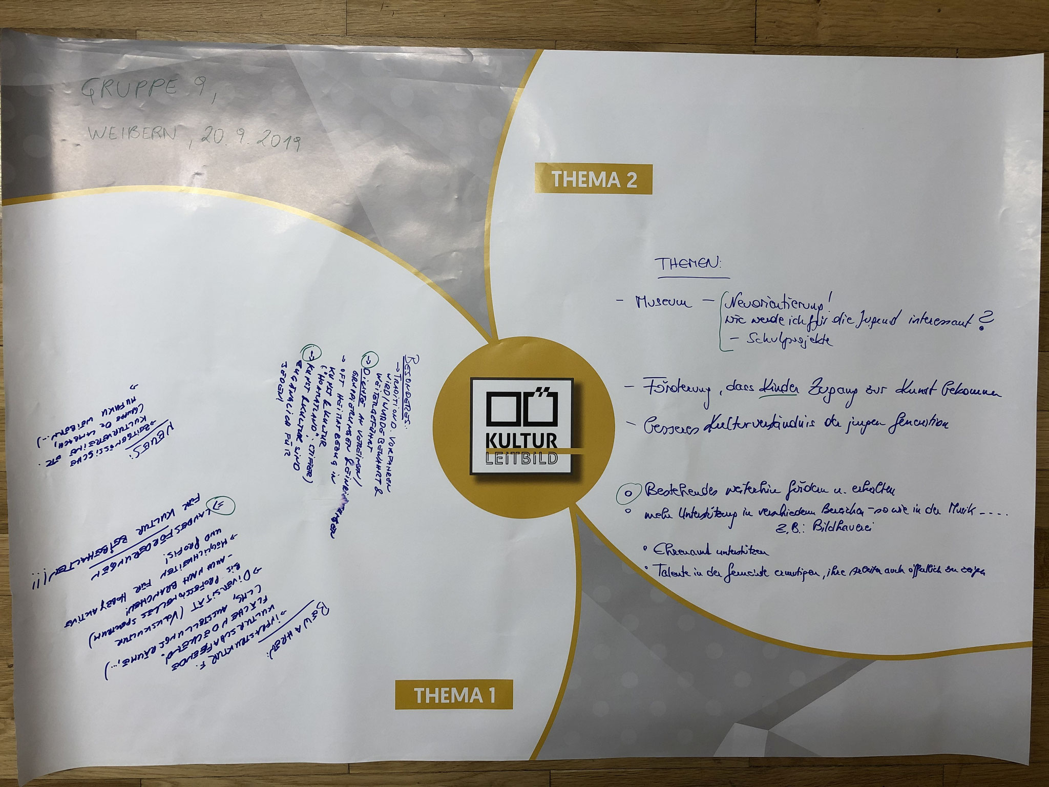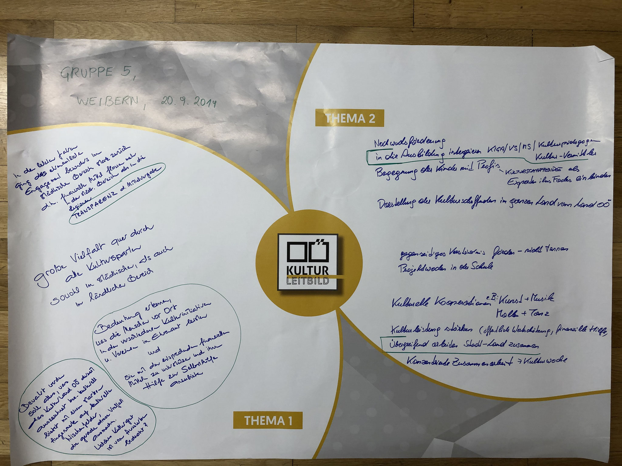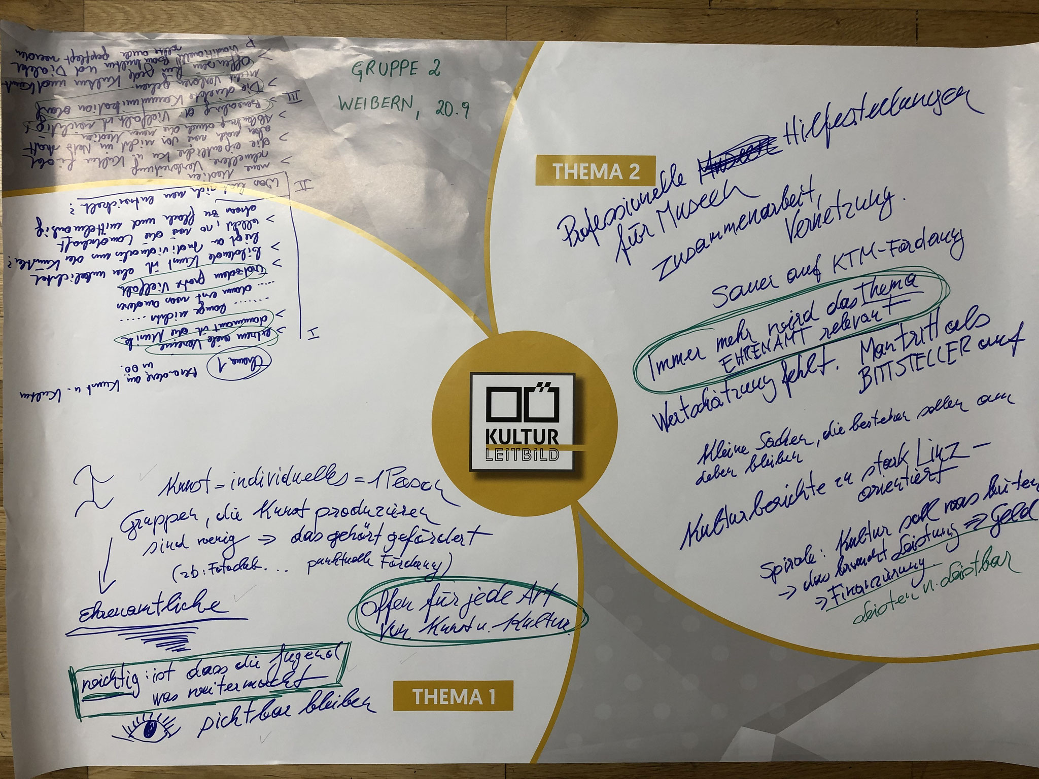 Im Rahmen der regionalen Diskussionen sind die Teilnehmerinnen und Teilnehmer eingeladen worden, in einem "World Cafe" (mehr zu diesem Format finden Sie im Blog) ihre Thesen zu zwei Fragenstellungen zu formulieren und auf einem Plakat niederzuschreiben: